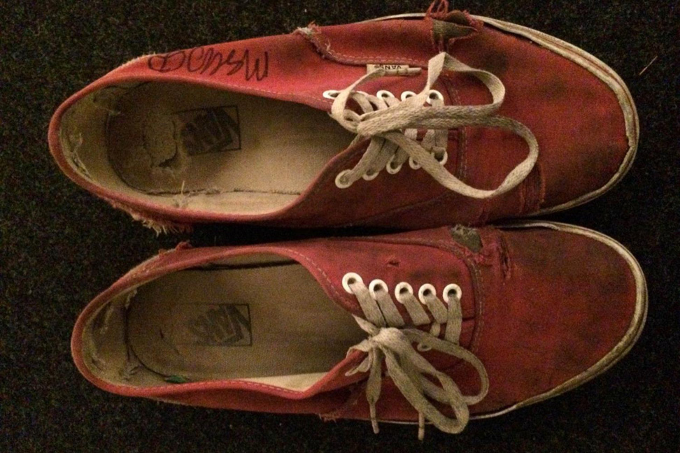 De rode, afgetrapte, stinkende, smerige Vans die Mac droeg tijdens zijn laatste tour zijn gekocht door een anonieme fan. De omschrijving voor de veiling luidde als volgt: “Will anyone buy an old stinky pair of shoes? I don’t know. lets wait and see. I’ll probably throw some other crap in the box before shipping it, I dunno what. If you’re one of those kids who tried to take them off my feet while I was crowd surfing at some point this year, nice try jackass. But hey, here’s another opportunity for you to have them.”